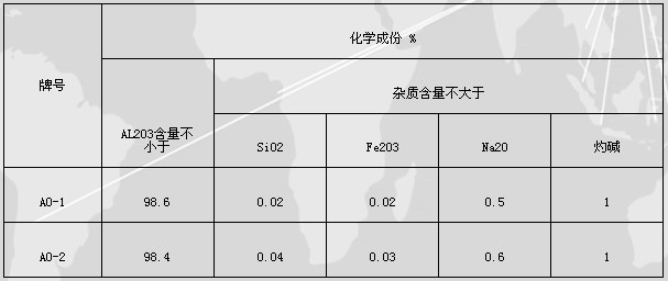 牌號化學(xué)成份 %AL2O3含量不小于雜質(zhì)含量不大于SiO2Fe2O3Na2O灼堿AO-198.60.020.020.51AO-298.40.040.030.61